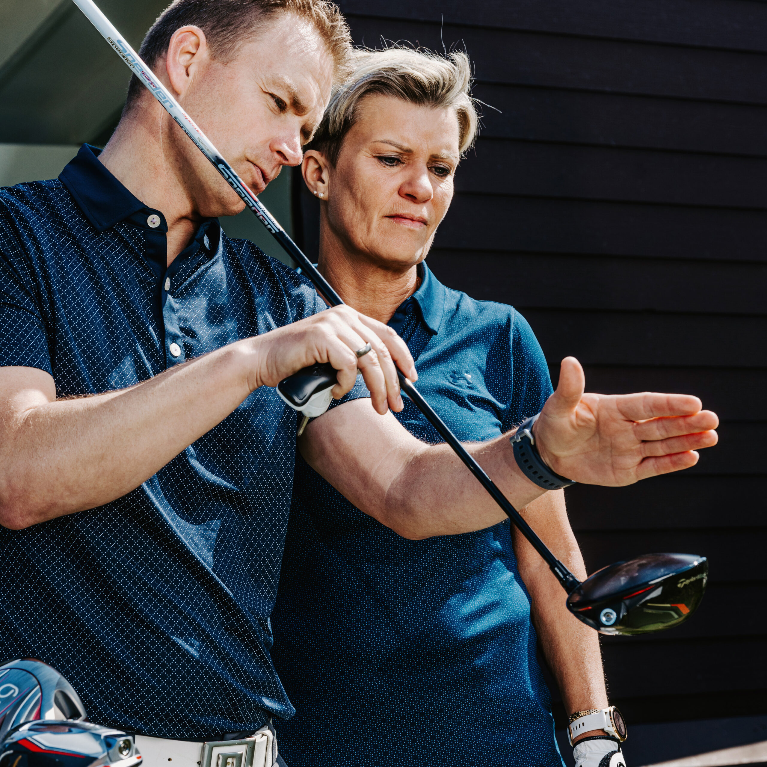 René förklarar för Lenette hur moderna drivers har utvecklats de senaste åren, för mer stabilitet och högre bollbana och bollhastigheter. Därefter kikar de tillsammans igenom de många alternativ som finns att välja på i butiken.